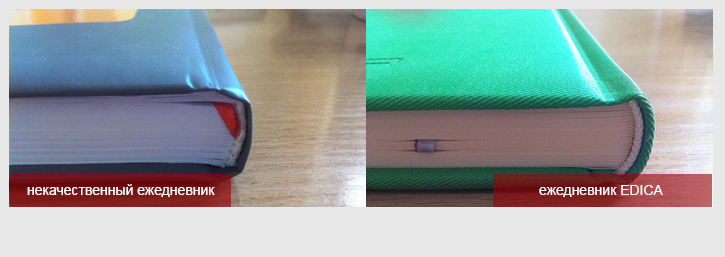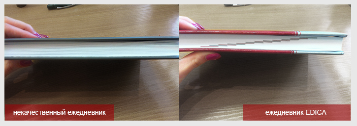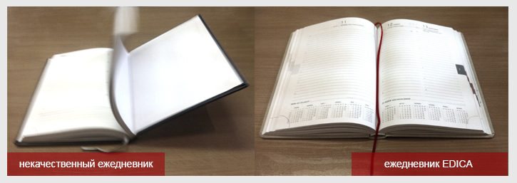 Положите свой ежедневник на стол и раскройте его. Закрылся? Качественный ежедневник должен лежать на столе, не захлопываясь. Внутренний блок ежедневника изготавливается из тетрадей, которые прошиваются нитями (это не даст страницам выпасть) и проклеиваются специальным клеем, который после высыхания остается достаточно эластичным. При использовании ежедневника Вы не должны придерживать его рукой. ВАМ ДОЛЖНО БЫТЬ УДОБНО ПИСАТЬ.